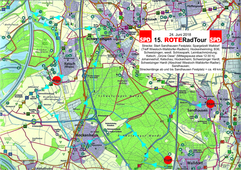 Am Sonntag, 24. Juni, startet um 9:00 h die 15.ROTERadTour vom Festplatz in Sandhausen. Mitradeln kann jeder und jede. Weil bei der zweiten Etappe der Leimbach-Tour das Rheinhochwasser den Besuch der Leimbachmündung in den Rhein verhinderte, fahren wir am 24. eine kleine Schleife auf der Leimbach-Route zur Leimbachmündung. Bei der Kollerfähre geht’s wieder landeinwärts in Richtung Ketsch zur „Grünen Oase“ zur Mittagspause. Diese sehr schön und ruhig gelegene Gaststätte – übrigens auch mit einer sehr schönen Spielwiese mit Spielgeräten für Kinder ausgestattet – ist eine Alternative zum immer überfüllten Johanneshof. Die Speisekarte in der „Grünen Oase“, einem Naturfreundehaus, lässt fast keine Wünsche offen und ein „Probeessen“ konnte voll zufriedenstellen. Nach der Mittagspause strampeln wir über Hockenheim und an der Rennstrecke vorbei wieder in den heimatlichen Wald.