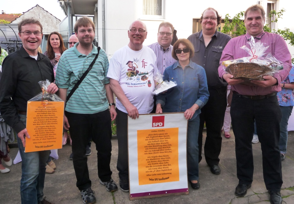 Die Glückwünsche und Umarmungen hätten nicht herzlicher sein können und alle waren der Meinung: Das hat er auch verdient! Fraktionsvorsitzender Thomas Schulze, würdigte sein „know-how“ in Sachen Finanzen genauso, wie sein Engagement für die Dorfschänke. „ Du tust das nicht, weil Du Dich gerne im Vordergrund siehst, sondern weil Dir die Sache wichtig ist. Das ist nicht selbstverständlich“. Frieder Flory sei nicht nur für die Fraktion ein Impulsgeber, sondern auch ein väterlicher Freund. Die SPD schätze ihn als Denker und Macher, möge aber genauso die humorvolle Seite an Frieder Flory, obwohl so mancher Witz nichts für zarte Gemüter sei. „Du bist eben einfach unser Frieder“. Dass Frieder Flory nicht nur gerne „Späßle“ macht, sondern auch Spaß versteht, zeigte sich an seiner Freude über ein T-Shirt, mit dem Konterfei von FF (Fiel Fergnügen), das von Jonas Scheid entworfen worden ist. Die SPD wünscht dem Jubilar alles Gute und sagt einfach nur: Danke!