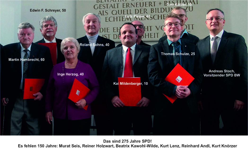 Zuerst wurde ein neues Mitglied in den Reihen der SPD begrüßt, Anja Blum. Danach dankte Thorsten Krämer den SPD-Mitgliedern für ihre langjährige Treue und Einsatzbereitschaft. Geehrt wurden Tom Kohler und Kai Mildenberger für 10 Jahre Mitgliedschaft, Thomas Schulze für 25 Jahre, Lutz Pieper, Inge Herzog und Roland Sohns für 40 Jahre, Edwin F. Schreyer für 50 Jahre und Martin Hambrecht, Ehrenbürger der Gemeinde Sandhausen, für schier unglaubliche 60 Jahre Mitgliedschaft in der SPD. Die Ehrungen nahmen Dr. Lars Castelluci (SPD-MdB) und Andreas Stoch (Landesvorsitzeder SPD BW) vor. Wenn man sich überlegt, in welchen Zeiten sich Menschen wie er bereits für die Ziele der Sozialdemokratie eingesetzt haben, ist der Respekt vor seiner Leistung und seinem Engagement enorm. „Ich bin stolz, derselben Partei angehören zu dürfen wie Martin Hambrecht“, erklärte der SPD-Ortsvereinsvorsitzende, Thorsten Krämer, und ergänzte, dass er mit Edwin F.Schreyer übereinstimmt, dass die Ideen und Ziele der Sozialdemokratie so aktuell wie eh und je sind. "Wir dürfen nur nicht nachlassen, sie immer und immer wieder zu erklären und dafür zu kämpfen." Nicht anwesend, dennoch für ihre langjährige Mitgliedschaft in der SPD geehrt: Reiner Holzwarth, Murat Seis (10 Jahre), Beatrix Kawohl-Wilde, Kurt Lenz, Reinhard Andl (40 Jahre) und Karl Knörzer (50 Jahre).