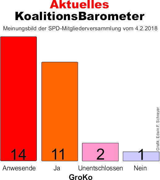 Zusätzlich wurde ein Stimmungsbild zu einer möglichen „GroKo“ erstellt. Die differenzierten Meinungen zur "GroKo" ergaben überraschend ein relativ klares Ergebnis. Von den anwesenden 14 GenossenInnen stimmten 11 Mitglieder (mit mehr oder weniger Enthusiasmus) für die Große Koalition, 1 Mitglied stimmte dagegen und 2 Mitglieder waren sich in Ihrer Entscheidung noch unsicher. Thorsten Krämer, Vorsitzender der SPD-Sandhausen, freute sich über die offene und faire Diskussion der Teilnehmenden bei der abwechslend Frauen und Männer zu Wort kamen.. „Die Herzen der anwesenden Genossinnen und Genossen schlagen nicht für eine Neuauflage der Großen Koalition, aber der Verstand tendiert zu einer Fortsetzung der Zusammenarbeit auf begrenzte Zeit. Wir werden weiter für einen Politikwechsel und mehr soziale Gerechtigkeit kämpfen.“