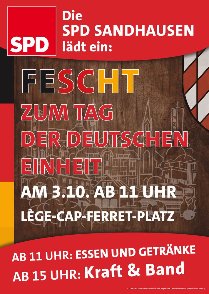 Wir laden daher ganz herzlich zum traditionellen „Fescht zum Tag der Deutschen Einheit“ am 3. Oktober ein. Gefeiert wird natürlich wieder auf dem Lège-Cap-Ferret-Platz. Los geht es um 11 Uhr, wir sorgen für Essen und Getränke und natürlich auch Livemusik. Wir freuen uns auf alle Sandhäuserinnen und Sandhäuser, die mit uns den Tag der Deutschen Einheit feiern wollen.